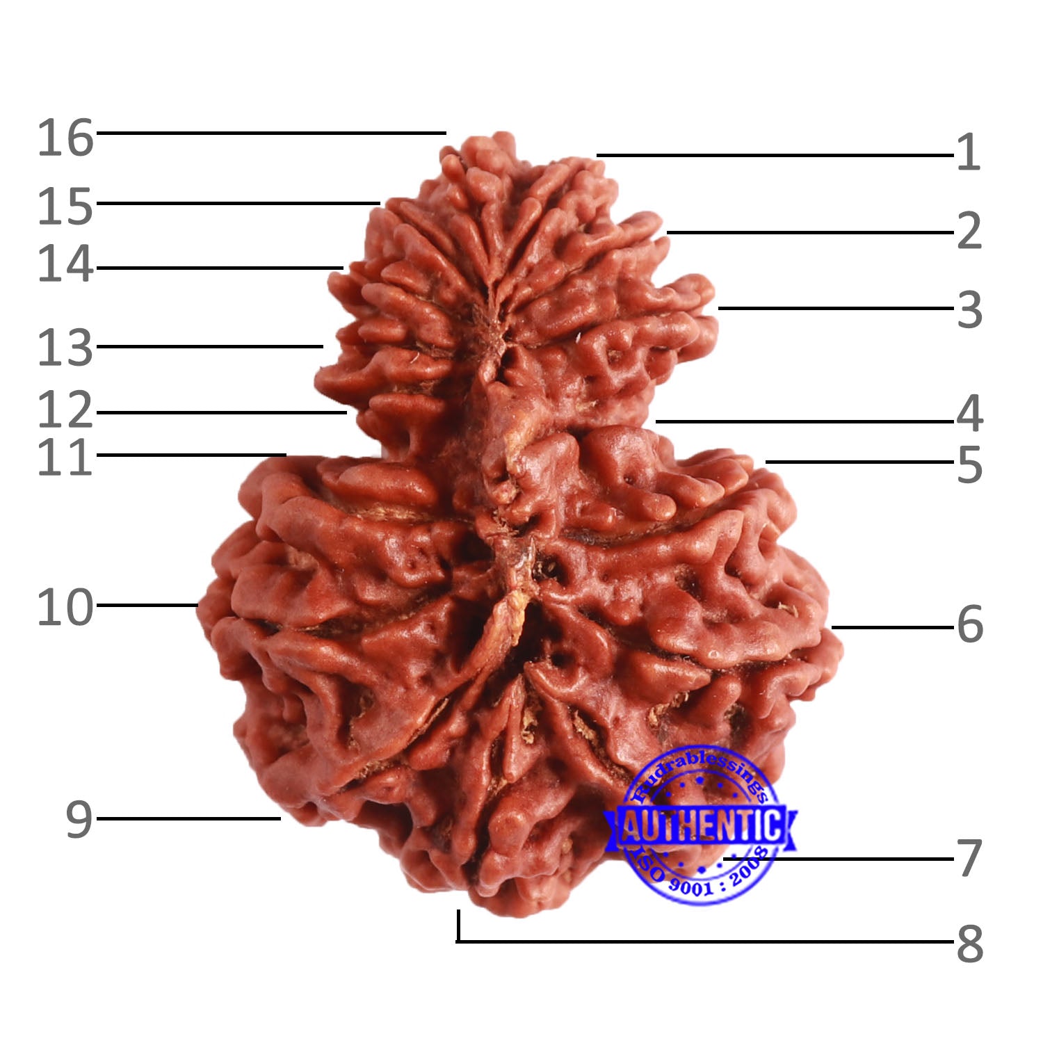This Rudraksha with 16 natural grooves is called Jai (victory) Rudraksha and the wearer attains victory at all levels.