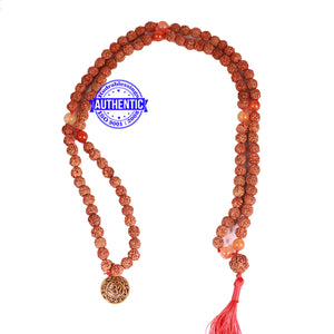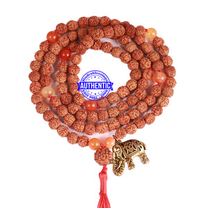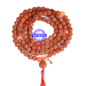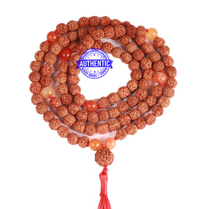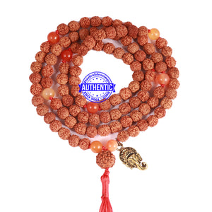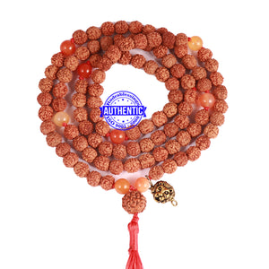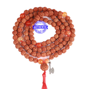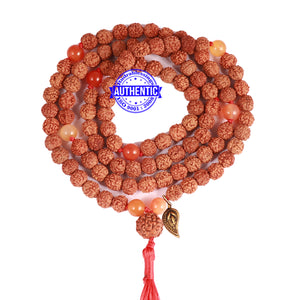 Name: Carnelian stone + Rudraksha Mala Configuration: 5 Mukhi Indonesian: 101 beads Carnelian stone: 8 beads Accessory used: Leaf. Making: Knotted in thread according to traditional style A unique combination of Rudraksha and Carnelian stone.
