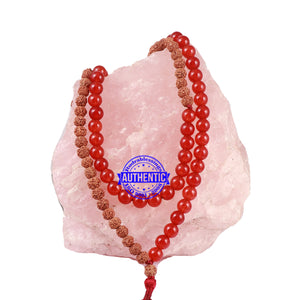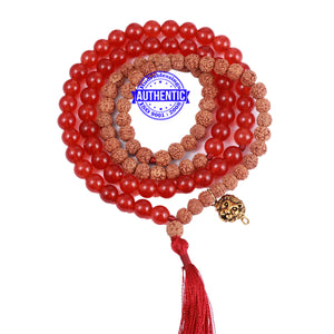 Name: Red Aventurine stone + Rudraksha Mala Configuration: 5 Mukhi Indonesian: 55 beads Red Aventurine stone: 54 beads Accessory used: Lord Parshuram Axe / Kulhadi Making: Knotted in thread according to traditional style
